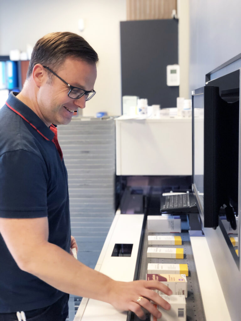 « Ohne den Kommissionierautomat wären wir nicht in der Lage, alle unsere Kunden effizient und schnell zu bedienen. Die zweiarmige Ausstattung des A3000 ermöglicht es, Kundentransaktionen und Online-Bestellungen in der Apotheke gleichzeitig zu bedienen. »